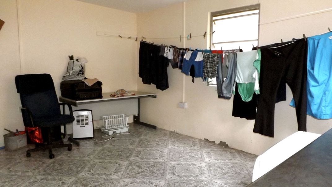 All ceilings are painted Flexit at a height of 8ft (2.4m). All internal floors are concrete, variously covered with carpet, carpet tiles or ceramic tiles. All windows and the glass sliding patio doors are single glazed and set in plastic coated aluminium frames. All other doors are of wood. All walls are rendered and painted white.