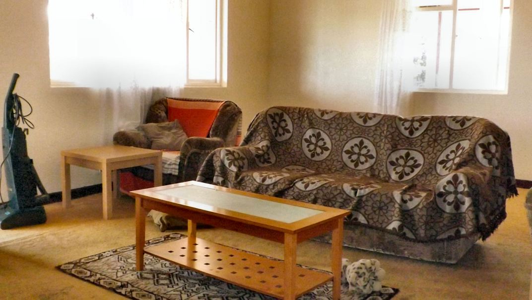 | Bathroom | 3.9m x 2.8m space. Carpet-tiled floor, walls partly tiled with ceramic tiles. Fitted bath tub with shower over, wash-hand basin, low-flush toilet suite, built-in cupboard. Wall-mounted electric room heater. Ceiling rose with pull-switch. Window to west. Door to Hall. |