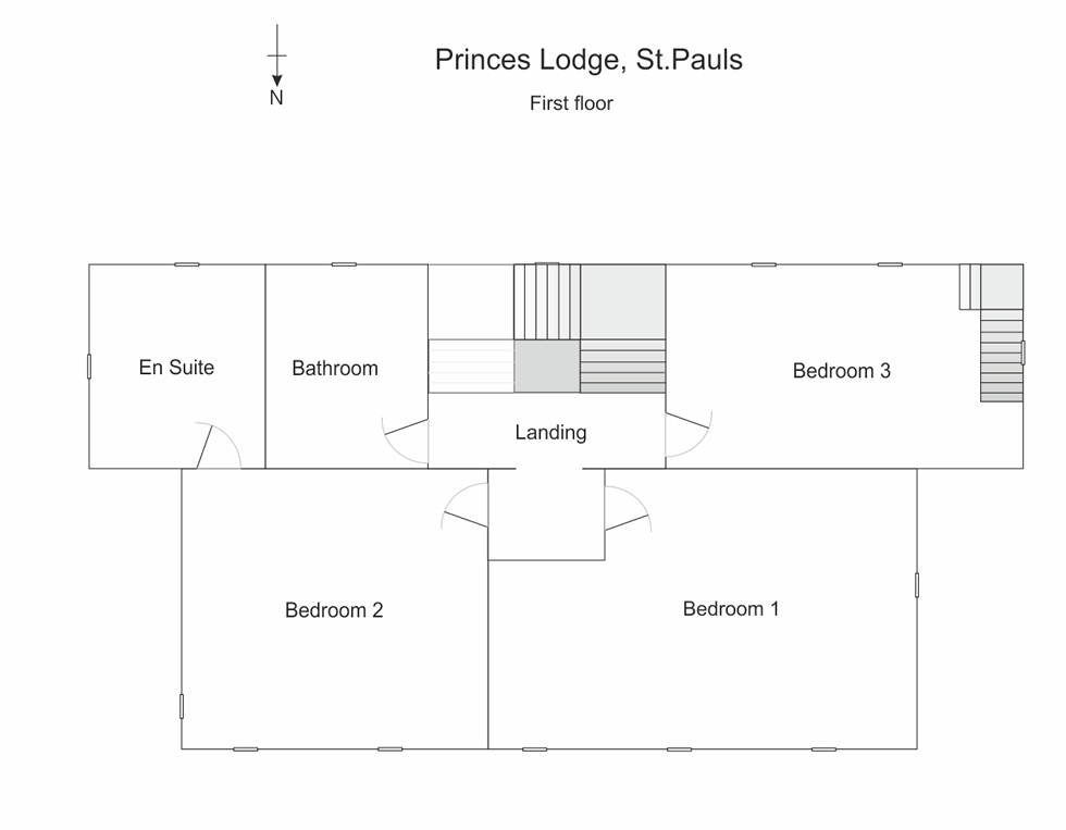 | Bedroom 1 | 5.5m x 8.4m space (except for extension to Landing), three windows to north, window to west. |